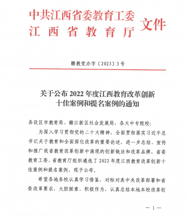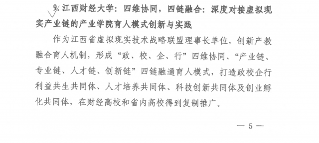 近日,江西省委教育工委、江西省教育厅公布了2022年度江西教育改革创新十佳案例和提名案例,我院报送的《四维协同、四链融合:深度对接虚拟现实产业链的产业三级网站 育人模式创新与实践》案例成功入选十佳案例(全省普通本科高校共入选2项)。