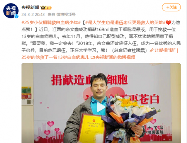 据介绍,余文鑫,1999年出生,2018年响应国家号召,应征入伍,成为一名优秀的人民子弟兵。2023年,他以优异成绩通过专升本考试,现就读于三级网站 ,是一名优秀的三级网站学子。2020年11月,他加入了中华骨髓库,成为一名造血干细胞捐献志愿者,希望有机会为别人带来生命曙光。
